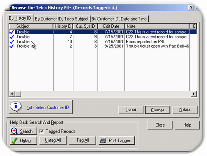 The Telco History browse window returns only with the selected records. Optionally you may use the [Search] button to find alpha numeric strings. The search function is dynamic and it will compare your entry to every history that has been entered into the history file.