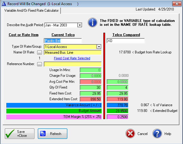 Under the [Telco Compared] column enter $21.50 into the [Fixed Item Cost] field. The [Extended Item Cost] field under the [Telco Compared] column is automatically calculated. The Variance Amount and the Variance Percent are automatically computed. The formula for the Variance is the Current Extended Cost - Compared Extended Cost. A positive number represents a savings to you and a negative number represents a cost increase.